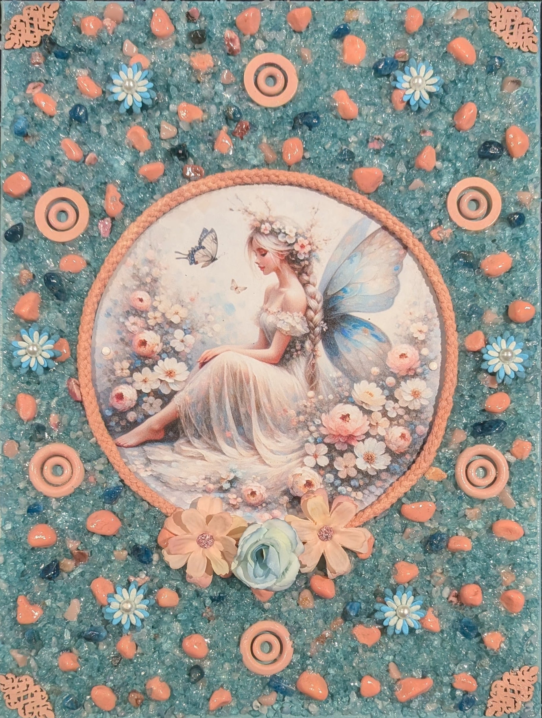 The canvas is framed with pale pink rope, creating a soft yet elegant border, while pink wooden circles and intricate wooden patterned corners add a charming, rustic touch. Scattered throughout the canvas are pale pink stones, along with aqua and pale blue crystals and stones, which lend a touch of sparkle and texture to the artwork.