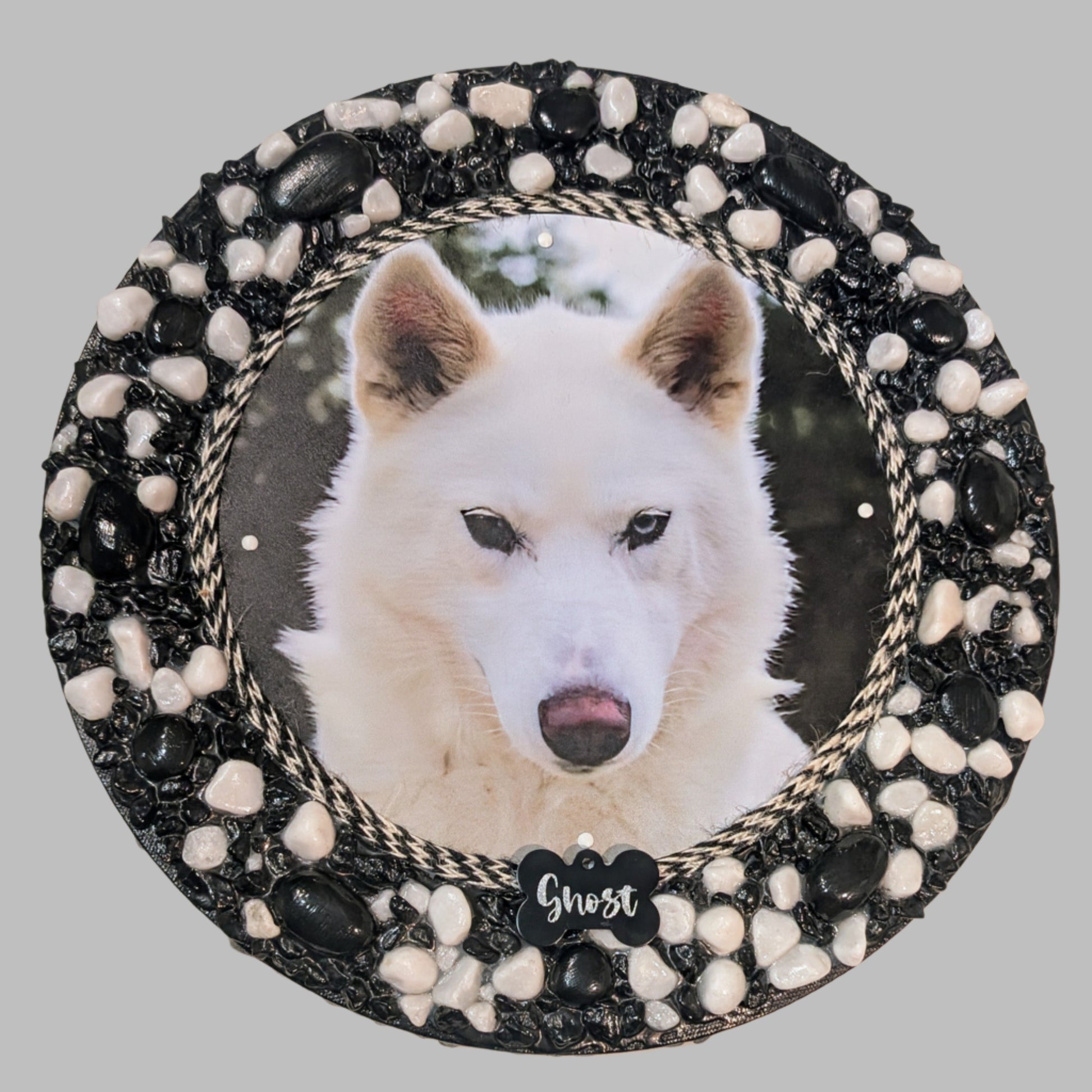 This handmade canvas artwork features a beautifully detailed white husky, meticulously crafted using black and white stones and pebbles, giving it a one-of-a-kind texture and depth. The husky’s captivating features are highlighted by the contrast of black and white tones, and the piece is framed by a bold striped black and white border. For an extra personal touch, you can choose to add a custom engraved tag in the shape of a bone for an additional $13, or select other tag options depending on the print, person, or animal featured in your artwork. If you’d like a truly unique piece, you can send an image of your pet or loved one along with your desired colour scheme, and we will create a custom design tailored just for you. This handmade canvas is the perfect way to showcase your love for your furry friend or capture a special memory.