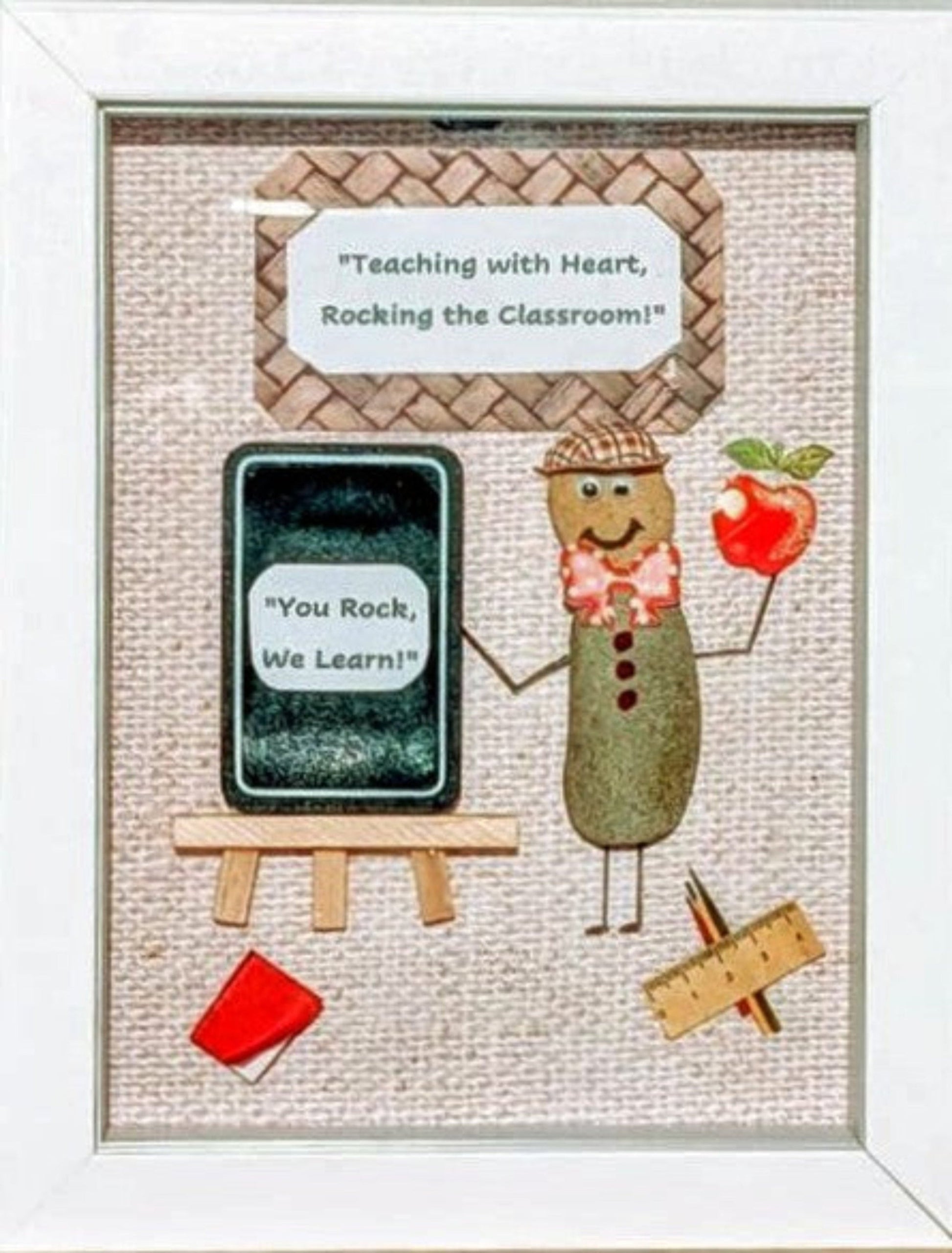 "Rocking the Classroom" is a charming and playful piece of stone art that brings the spirit of education to life. The artwork features a teacher, dressed in a plaid cap and bow tie, exuding a sense of wisdom and authority with a fun, approachable twist. In one hand, the teacher holds an apple, a timeless symbol of knowledge and care, while the other hand points to a blackboard, guiding students with enthusiasm and expertise. On the floor, a book, pencils, and a ruler are scattered, adding to the classroom ambiance and highlighting the tools of learning. This piece celebrates the dedication and passion of educators who "rock" the classroom, making it an ideal tribute to teachers and the joy of learning.
