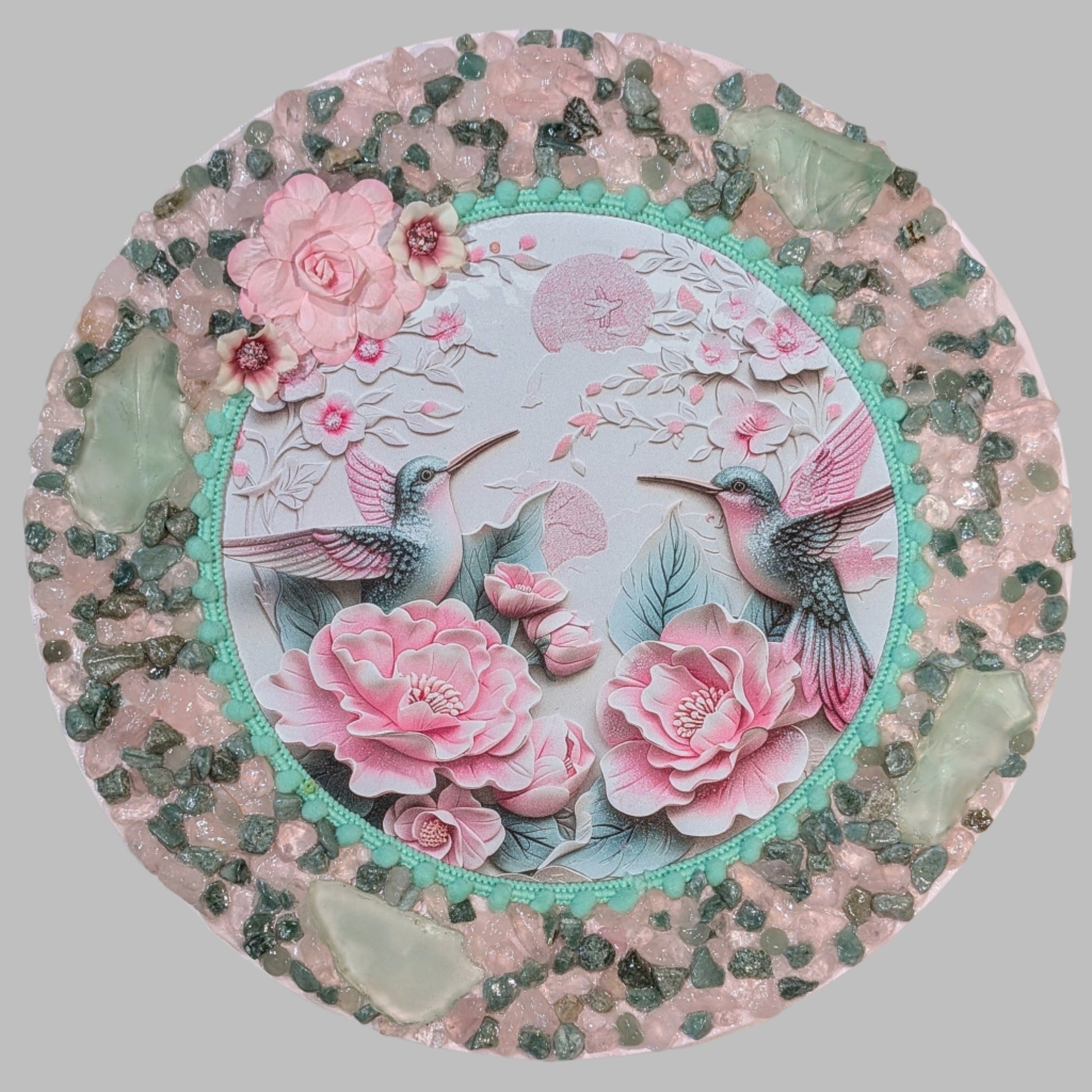 Add a touch of nature and elegance to your space with this beautiful handmade canvas, featuring two pink and mint green birds gracefully surrounded by vibrant pink flowers. The canvas is framed with a soothing mint green border, creating a calming focal point for any room. Decorated with four large mint green stones and a mix of green and pink pebbles, the piece is elevated with the delicate touch of three faux pink flowers. This artwork is perfect for adding a fresh, floral touch to your home or office, offering both colour and texture in a stunning, one-of-a-kind design.