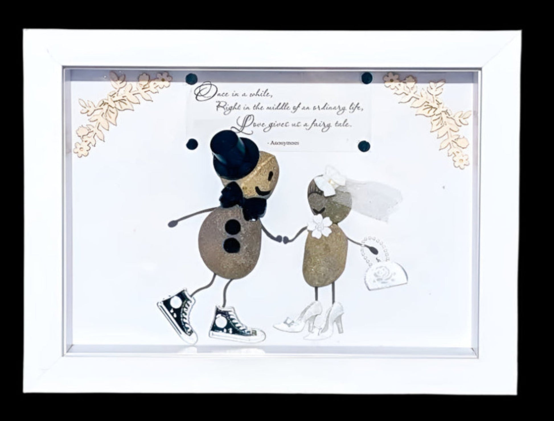 This framed stone art beautifully captures the essence of a couple’s special day with a whimsical and modern twist. The groom, dressed in sneakers, a classic top hat, and a bow tie, exudes a playful yet refined charm. The bride, elegant in high heels, a flowing veil, and a stylish handbag, radiates grace and sophistication. Together, they strike a perfect balance of tradition and individuality, symbolising the unique blend of their personalities. The artwork is framed with decorative wooden edges on the top corners, adding a touch of rustic elegance that complements the piece's overall romantic and modern aesthetic. A stunning portrayal of love, style, and togetherness, this piece is a timeless reminder of a couple’s journey down the aisle.