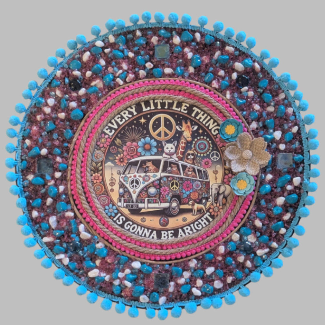 The artwork is lovingly framed with layers of soft pink rope and natural rattan rope, blending boho warmth with a playful pop of colour. The canvas is further decorated with blue, pink, and white stones and pebbles, adding texture, sparkle, and a grounding earthy vibe.